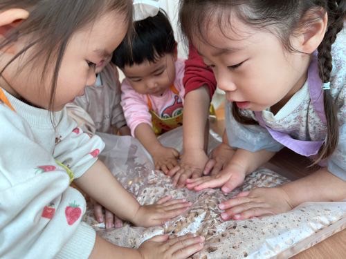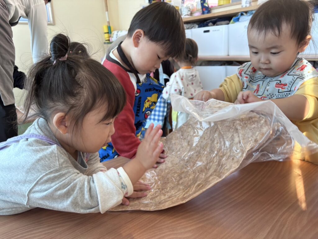袋の上から一生懸命につぶす子ども達。