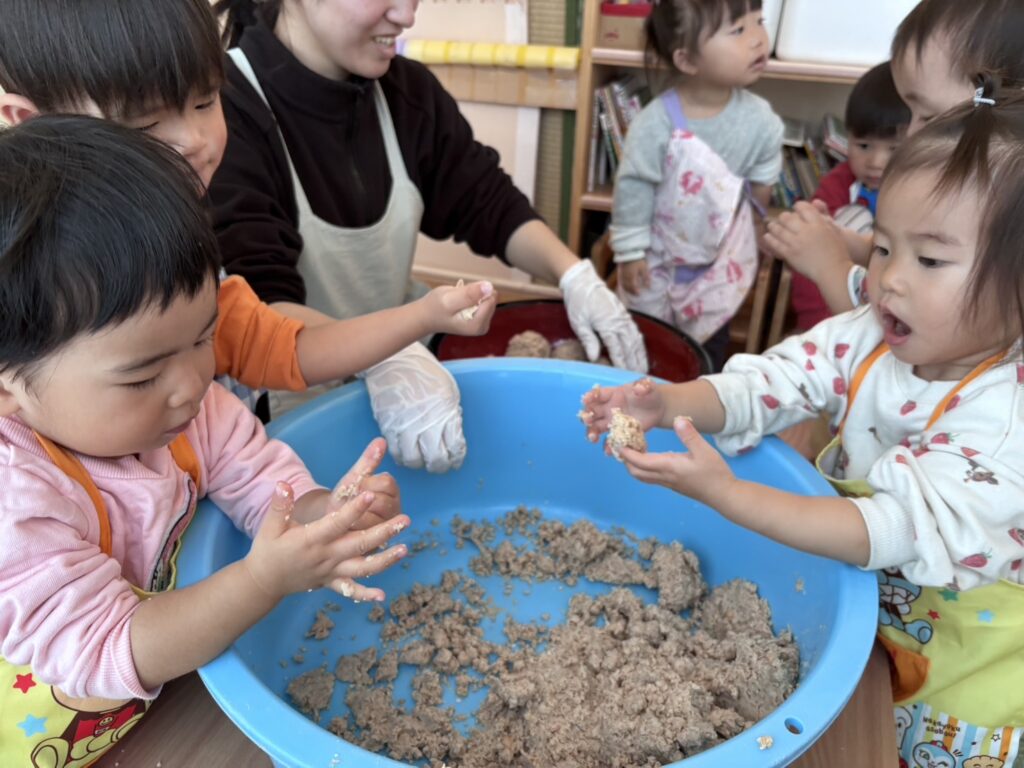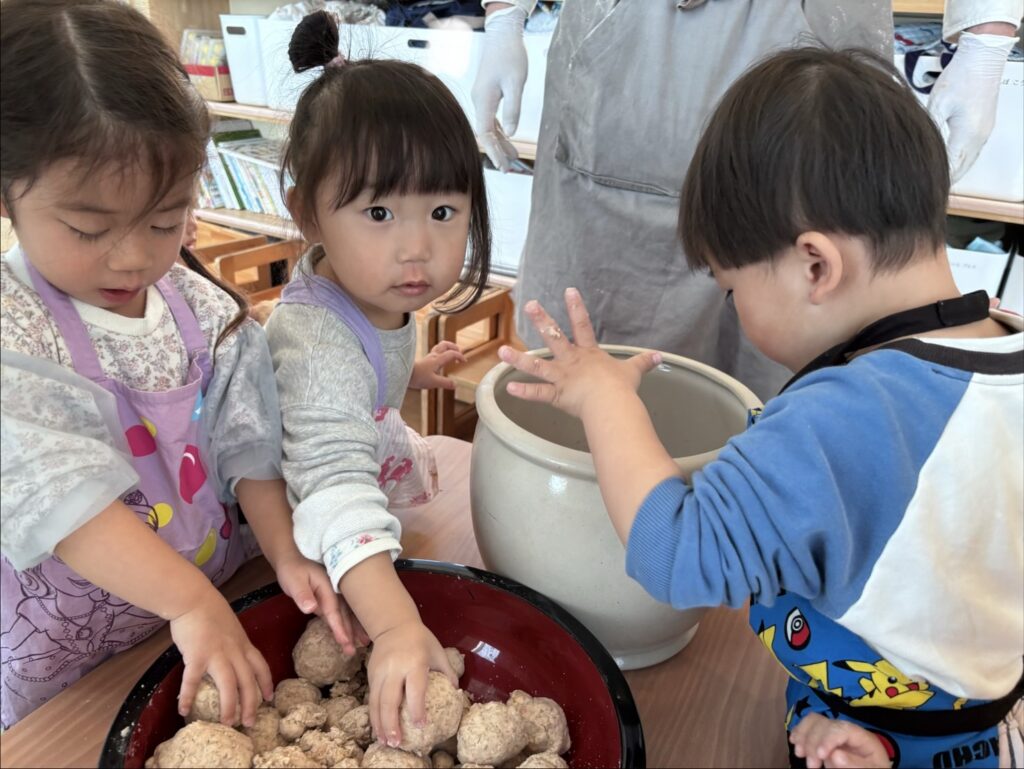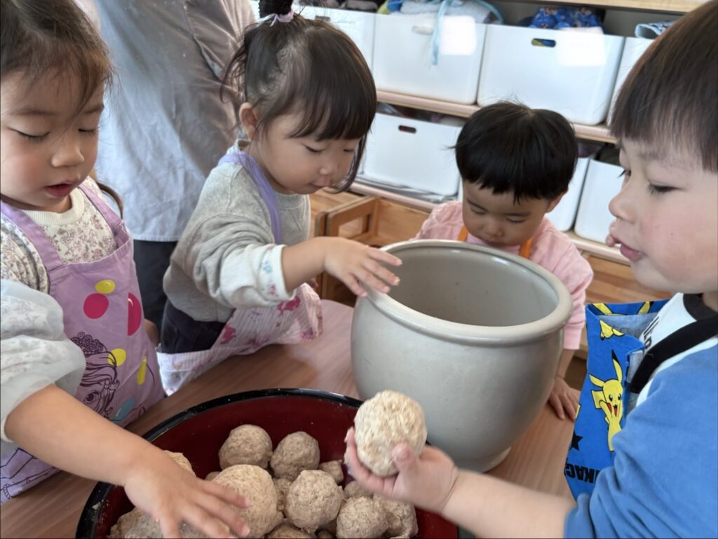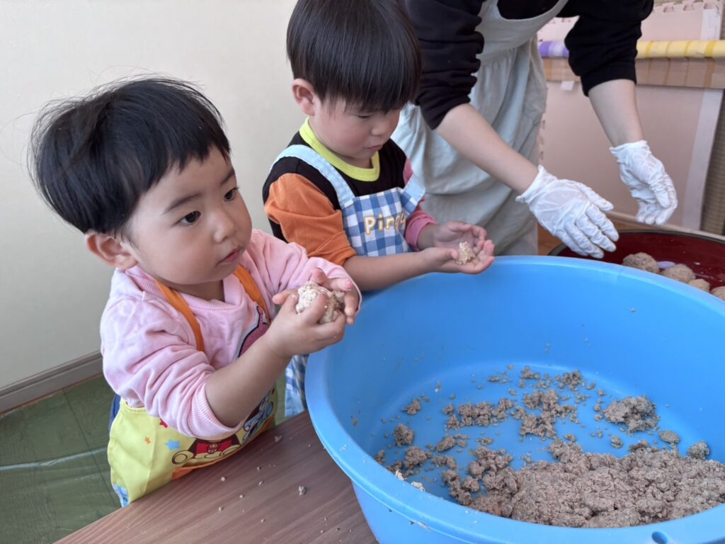 見様見真似で丸める子ども達。