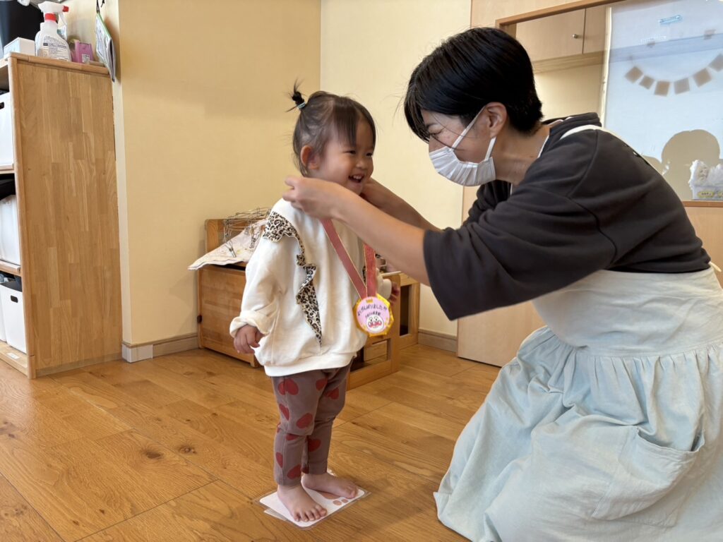 先生から頑張ったねとメダルをもらい、