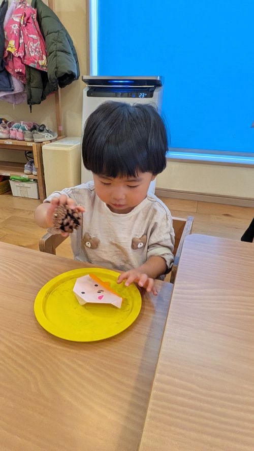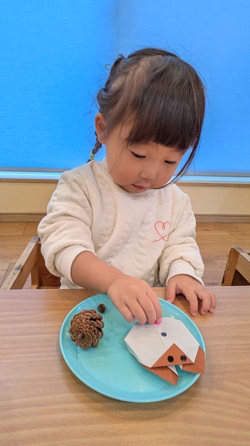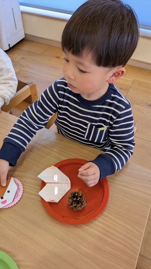 子ども達と折り紙でリスを作り、