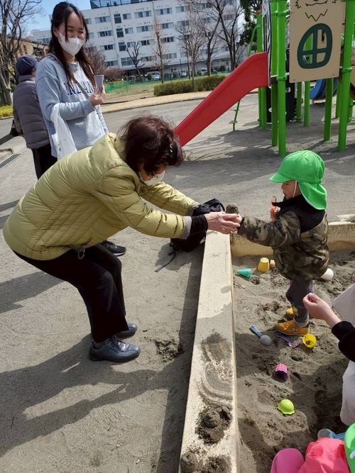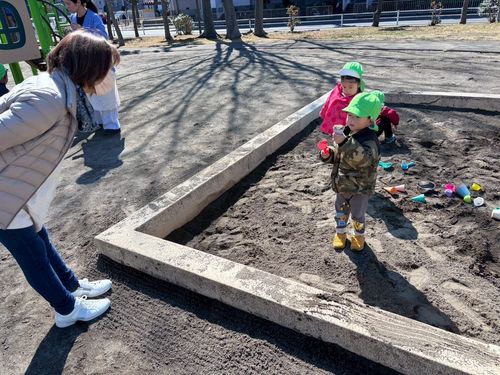 砂場でお客さんになってもらったり